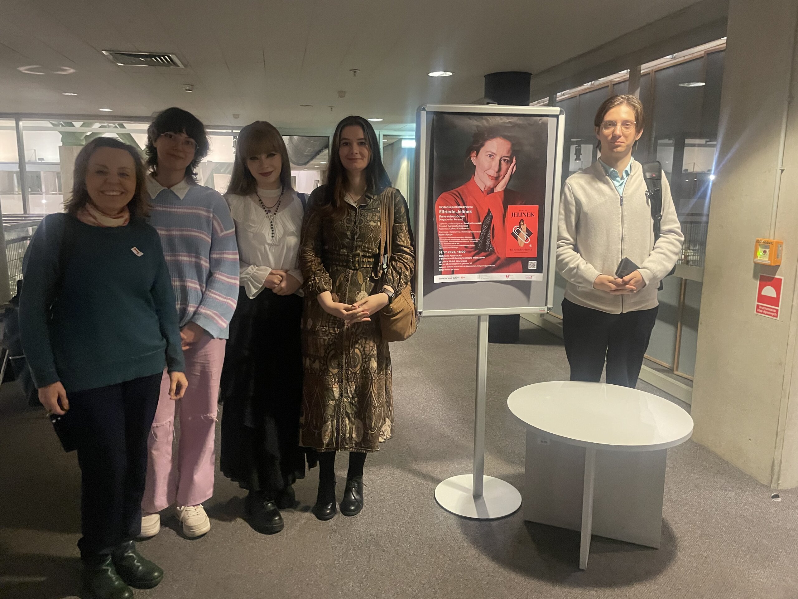 9 grudnia 2025 roku udaliśmy się na czytanie performatywne „Danych odosobowych” Elfriede Jelinek w Bibliotece Uniwersyteckiej w Warszawie. Warto dodać, że Elfriede Jelinek – jedna z najważniejszych i najbardziej bezkompromisowych pisarek współczesnej literatury europejskiej – 20 października 2026 roku kończy 80 lat, a „Dane odosobowe” są jej najbardziej osobistą książką.